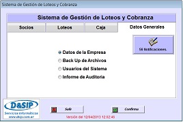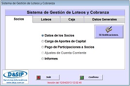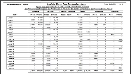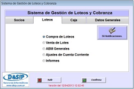 A partir de la carga de los Datos de los Loteos y de los de su posterior Venta el sistema permitirá el Seguimiento y Gestión de las Cobranzas y de la Cuenta Corriente de Participación de los Socios, con informes Particulares y Consolidados de los Loteos y de Movimientos de Caja.